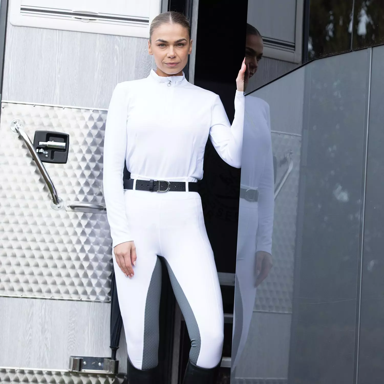 Technical thermal stretch winter competition shirt, with brushed fleece lining. Ideal for winter dressage and riding club activities. Features front zip front placket with Equetech horse bit puller, crystal detail around the collar and stock collar with loop to back to secure stock. Machine washable. Knitted 95% polyetser / 5% Lycra.