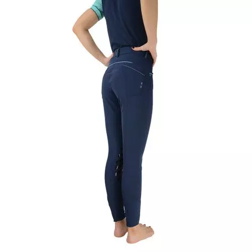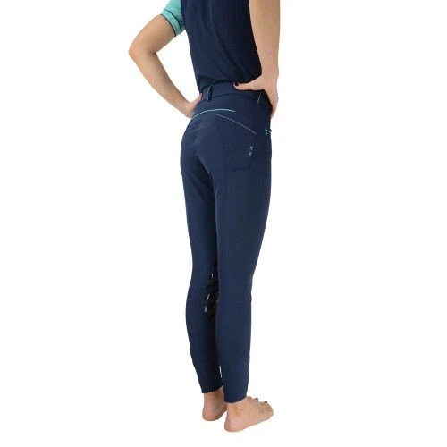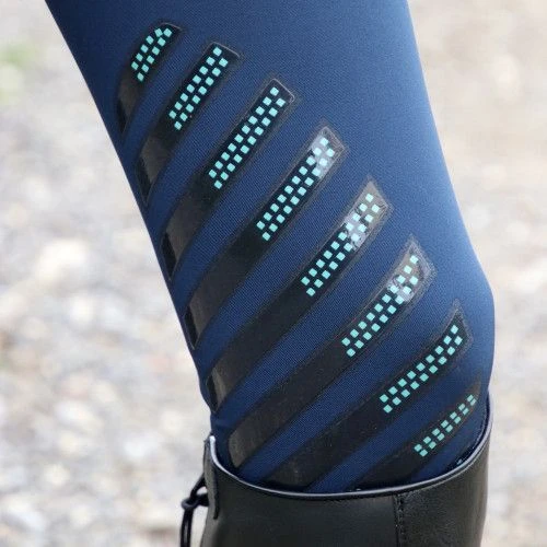 These breeches are made from a technical stretch fabric which allows excellent flexibility and provides a comfortable and flattering fit. The contrasting silicone knees give extra security in the saddle and the no bulk stretch hem ankles fit seamlessly under riding boots. These navy breeches are complemented with an attractive peppermint green trim on the front pockets and on the back below the waistband. Additional features include back pockets and belt loops with contrasting stitching.