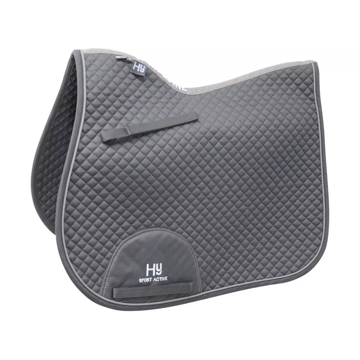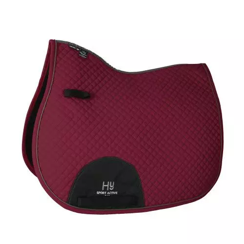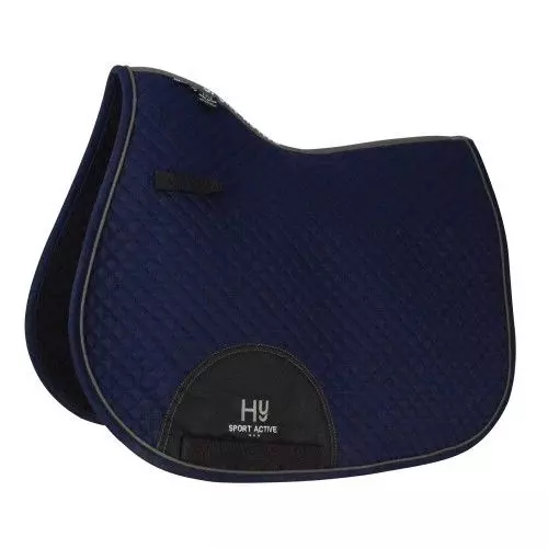 A traditional and classic shaped general purpose saddle pad, designed to fit a wide range of saddles. Featuring the signature HyWITHER cut to provide clearance over the withers to prevent rubbing. This shape makes it simple to fit and offers ultimate comfort. The pad is made from high-quality cotton and a moisture wicking lining. It also features a durable anti-rub girth cover protection, complete with double touch tape girth loops for a secure and precise fit. Available in all the exclusive Hy Sport Active colours with charcoal grey contrast piping and spine to match the rest of the collection, suiting a variety of horses and tastes. Machine washable.