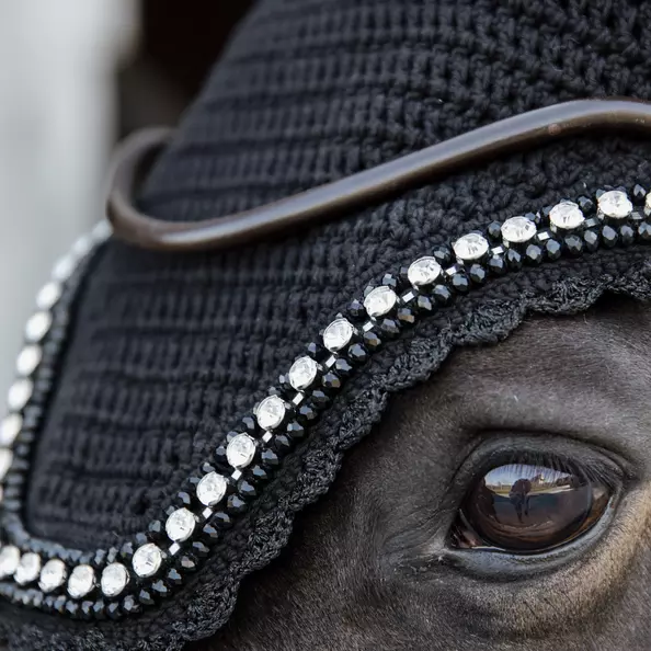 The materials of the ears are stretchy to fit all kinds of horses. We’ve included an extended neckpiece to avoid the fly veil from slipping under the bridle. There’s no logo on the front of the fly veil, so there’s still room for embroidery. Handwash only!