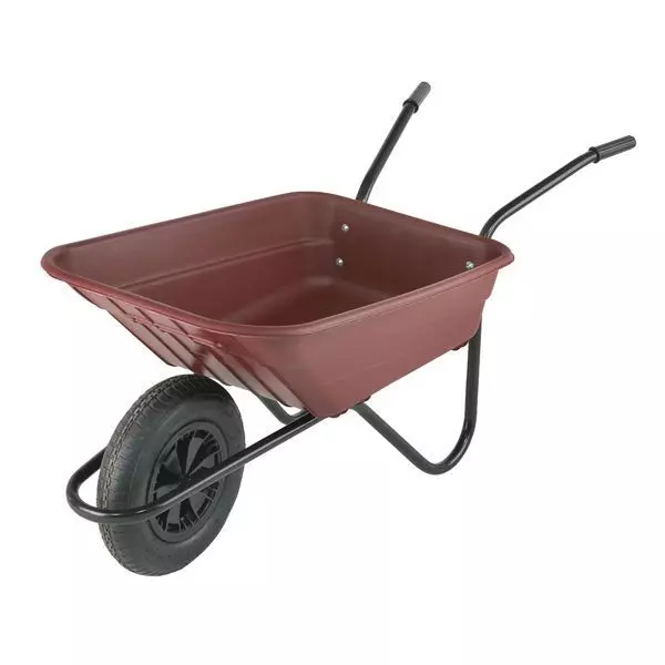 This wheelbarrow features an extra rigid and durable polypropylene pan and tubular frame with tipping nose and powder coated finish.