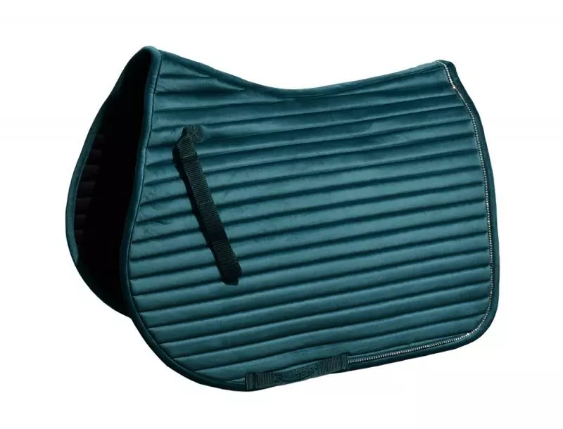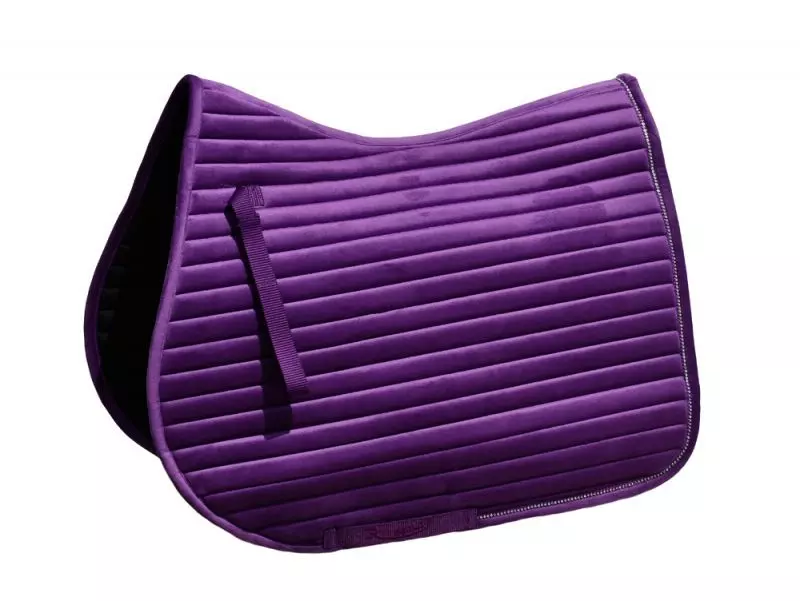 Luxury velvet saddle cloth with channel design quilting enabling a super comfortable fit around the horse. With touch tape fasten girth secure straps and girth placement straps. Fully breathable lining. Self- colour Rhinegold embroidered logo to girth strap. Finished with diamante trim to complete this luxury look.