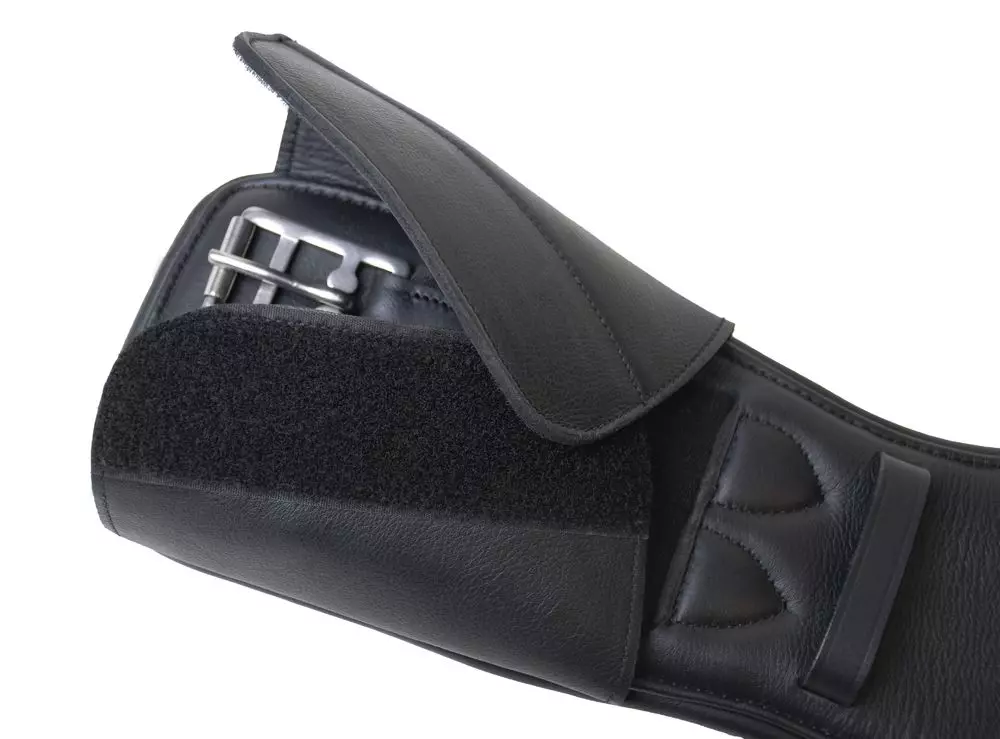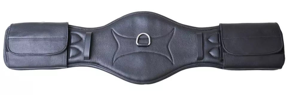 Beautifully soft leather dressage girth, fully padded with a memory foam inner, elasticated ends for the Horses comfort and soft leather touch tape closure buckle guards