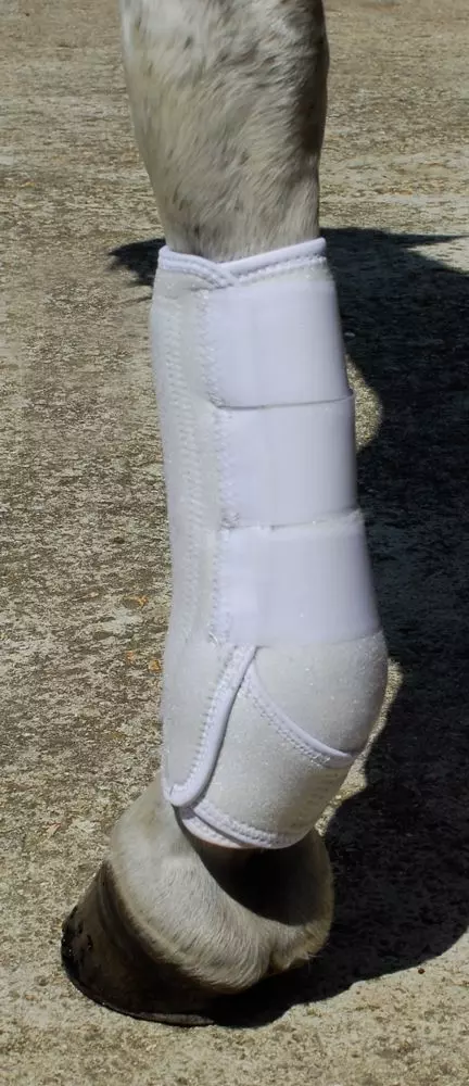 Neoprene support boot with soft textured outer, four wide strap touch tape fastening for ease of use and full fetlock support. A quicker alternative to bandaging offering full ligament support designed for front or hind leg use.