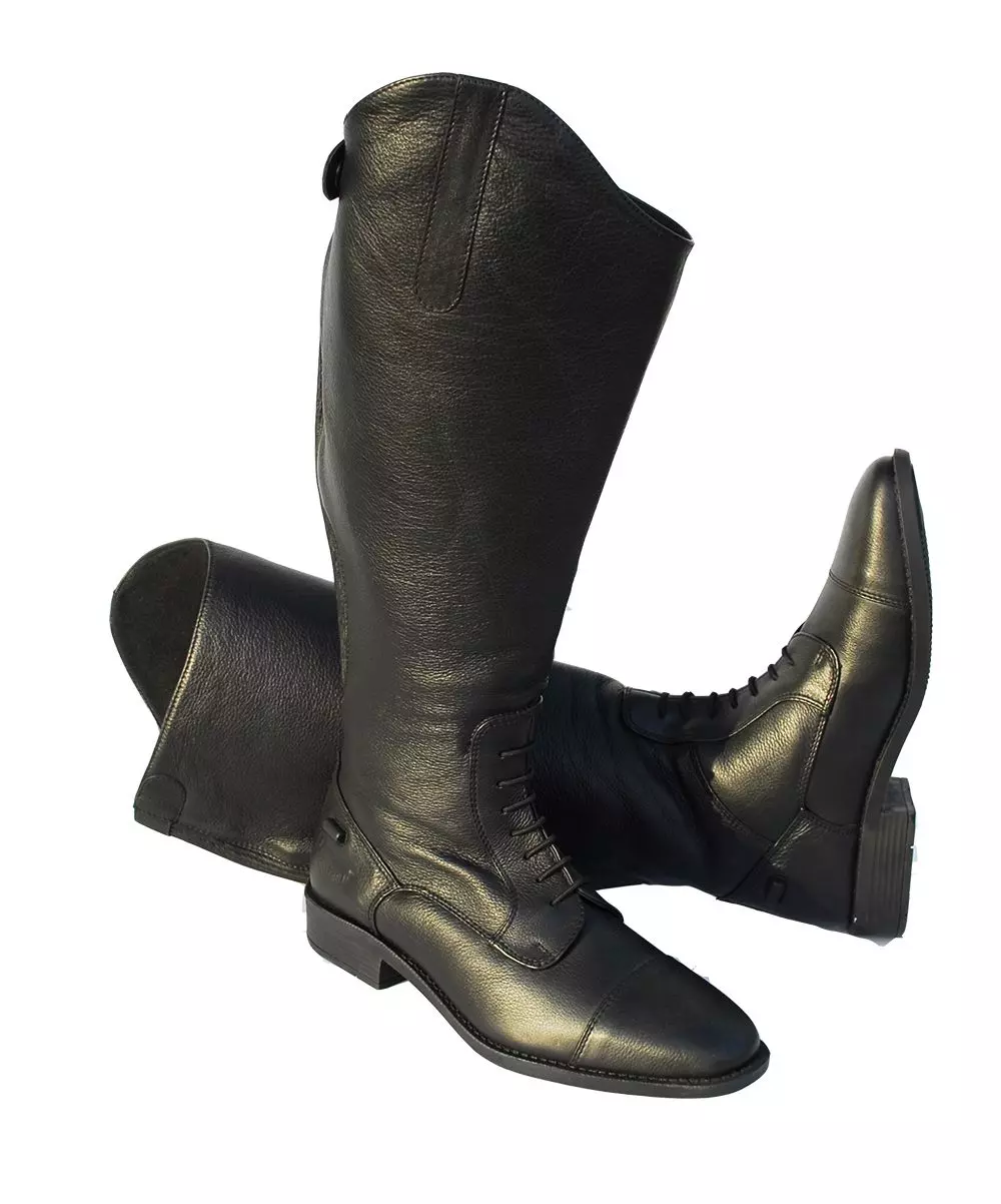 These luxury feel boots are made in soft feel leather giving the upmost comfort to the wearer .They feature an elasticated front lace detail and stitch detail on the toe cap. With a user friendly wider smooth feel zip pull and two pleated, elasticated leather sections at the back of the boot for a comfortable fit. The top of the zip is finished off with an elasticated strap and plain black press stud to the side. With spur guards and a sure grip sole these boots are practical as well as gorgeous to wear. The EW Luxus is styled with a wider calf and shorter fit.