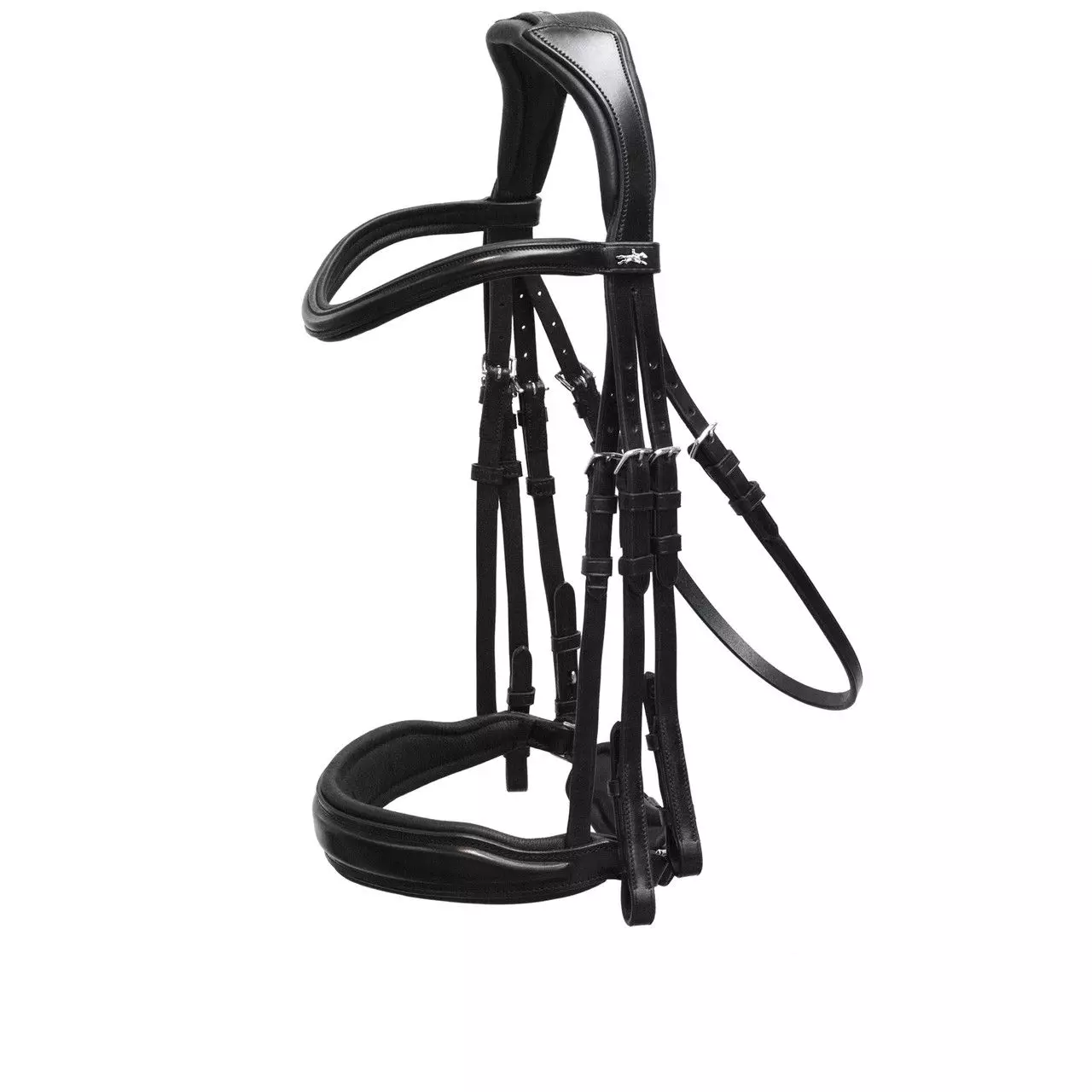 The Schockemohle Milan double bridle with an anatomically shaped noseband has a unique neck piece. MILAN was specifically adapted to the horse’s anatomy and allows unconfined movement of the ears. Due to the reduction of pressure in sensitive areas around cheekbone and neck, the comfort of the horse is considerably enhanced.
