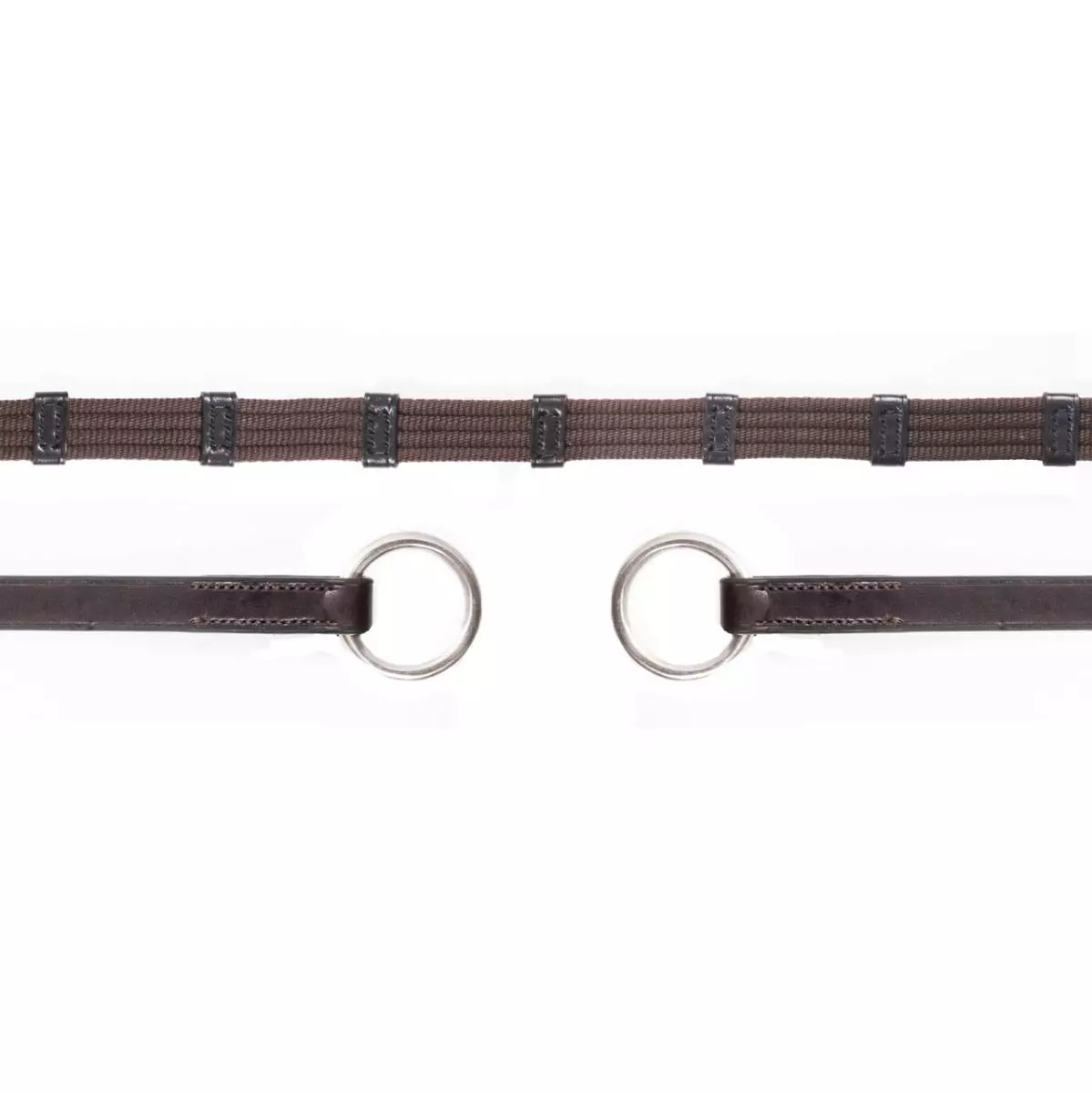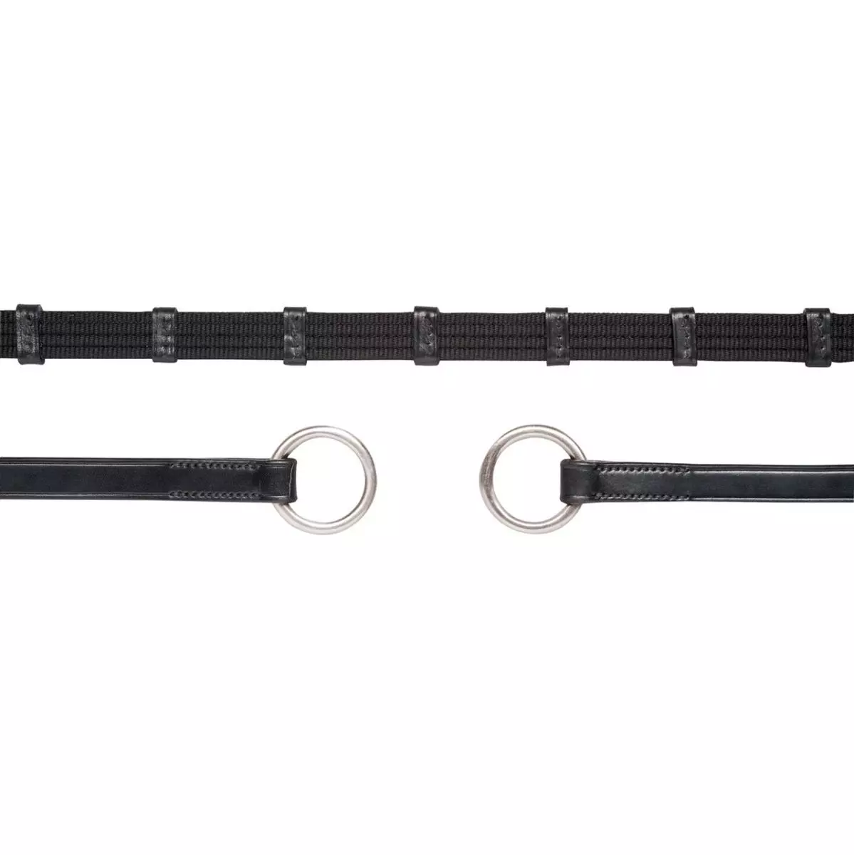With this wide Schockemohle BELT REIN with ring, double stops ensure that the correct rein length is easier and more individual to keep. The stable ring at the end of the reins offers an alternative method of fastening to the classic leather loop.