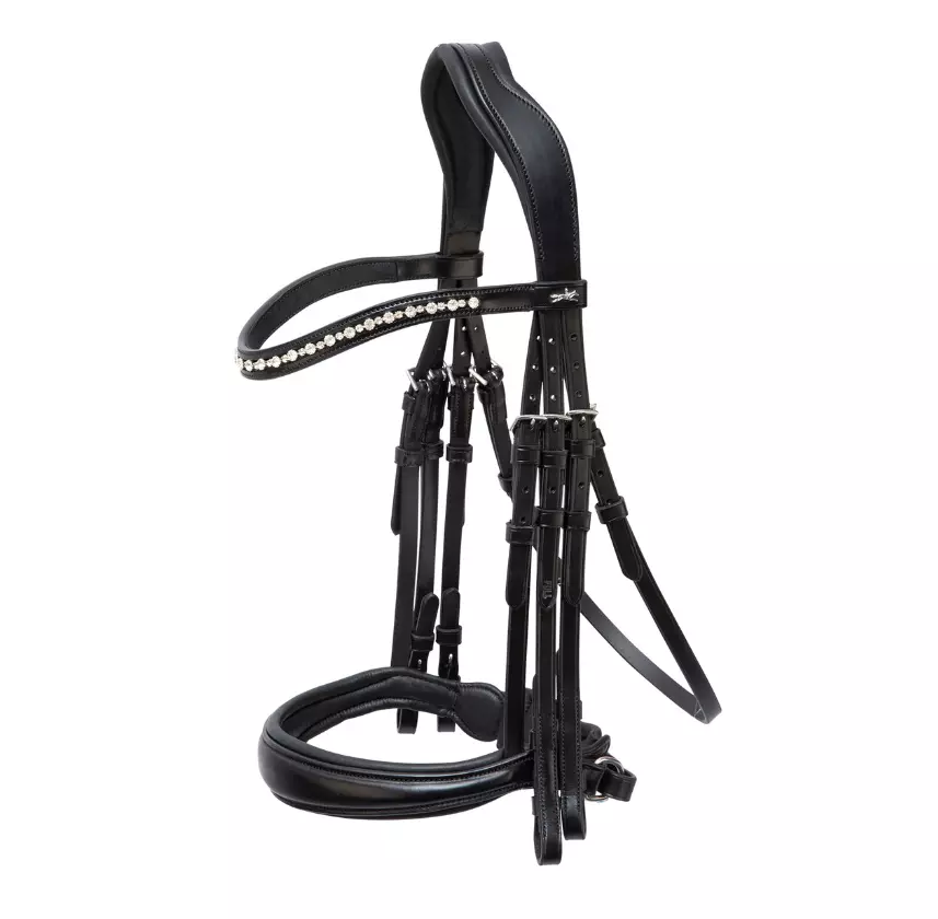 Milton is a brand new anatomical double bridle from Schockemöhle Sports with a headpiece based on the well-known Equitus models. Due to the anatomical shape, the head piece allows a lot of ear freedom and relieves the neck band. The special noseband offers maximum comfort for the horse thanks to its anatomical fit and wide, softly padded noseband. It is softly padded, tapering to the sides and also has lined D-rings and buckles. The elegant look is also underlined by the curved browband, which is decorated with crystals of different sizes.