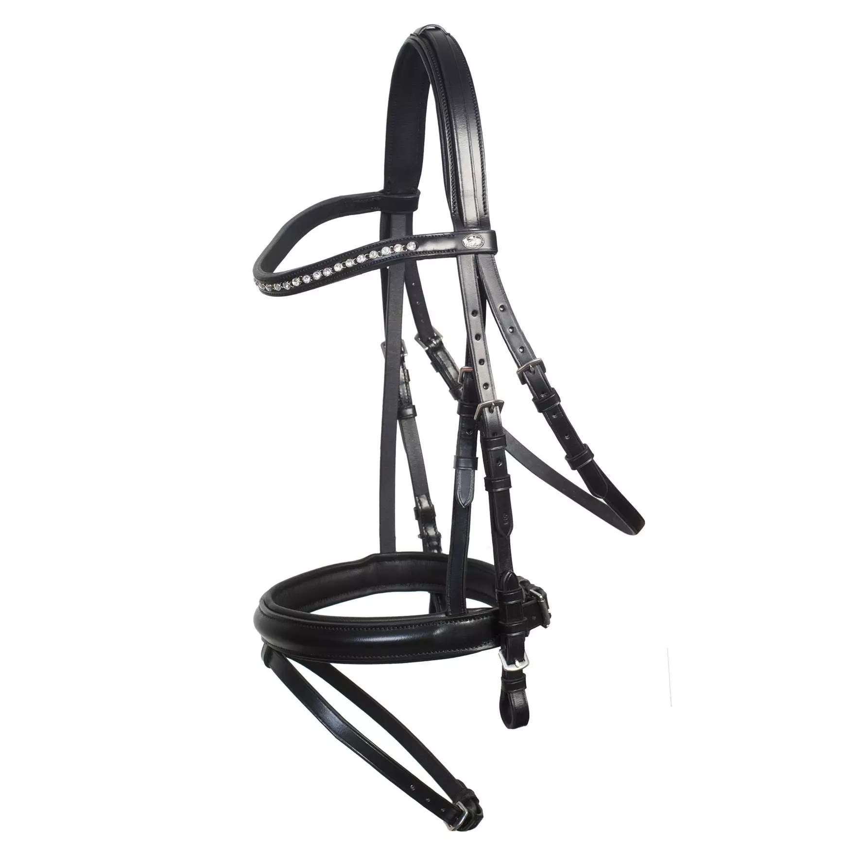 Schockemohle Neo Line Berlin Flash Bridle features a wide crank noseband with round shaped rings at sides, approx. 38 mm wide | slightly shaped and softly padded head piece | back pad with fixed loop | curved browband with big crystal rivets | cheek pieces with hook & stud | throat lash adjustable on both sides | new logo button