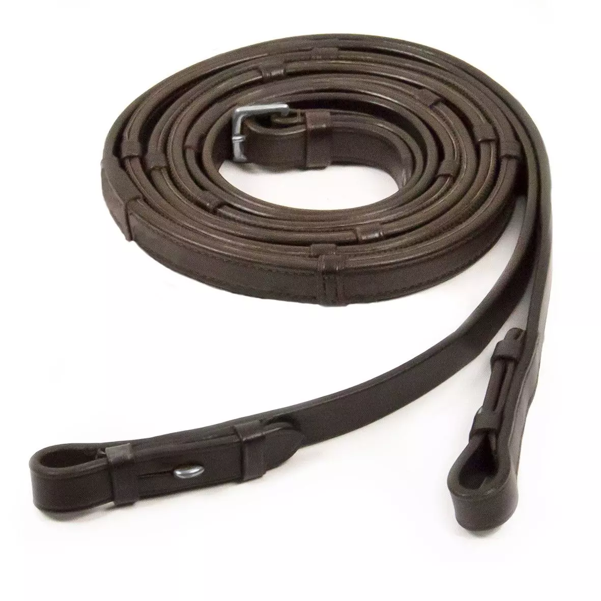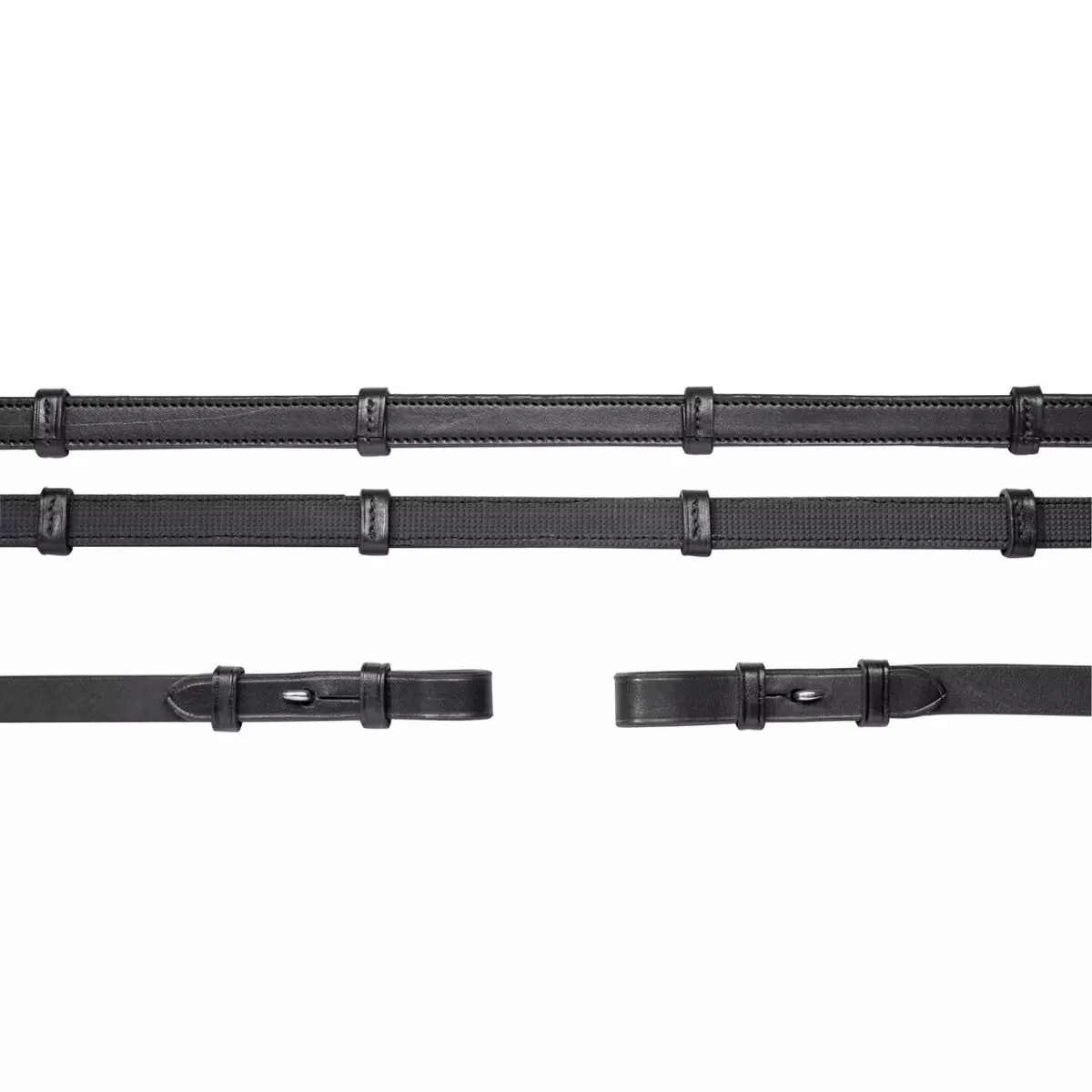 The Schockemohle Rubber BRIDLE REINS with bridle hook are made of high quality leather and have integrated leather bars. The 16 mm wide rein is extra grippy thanks to the rubberized back.