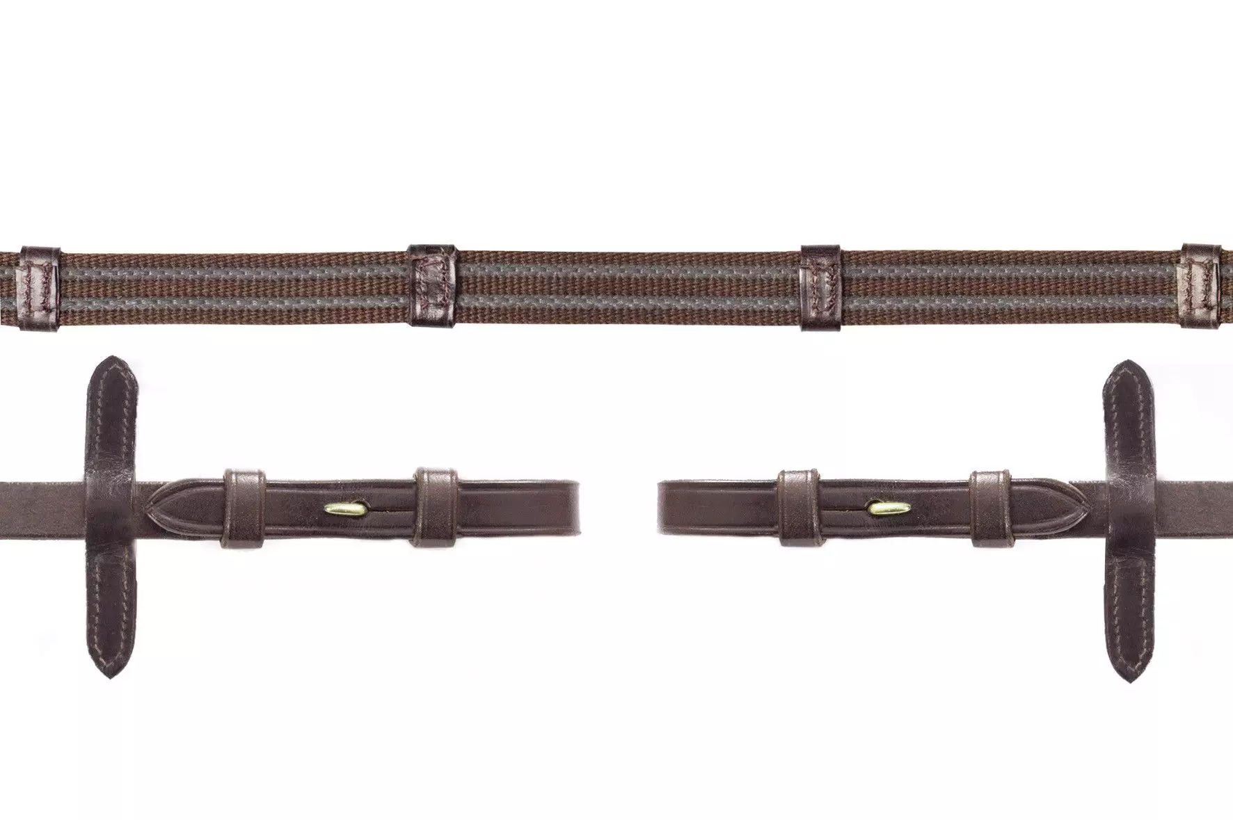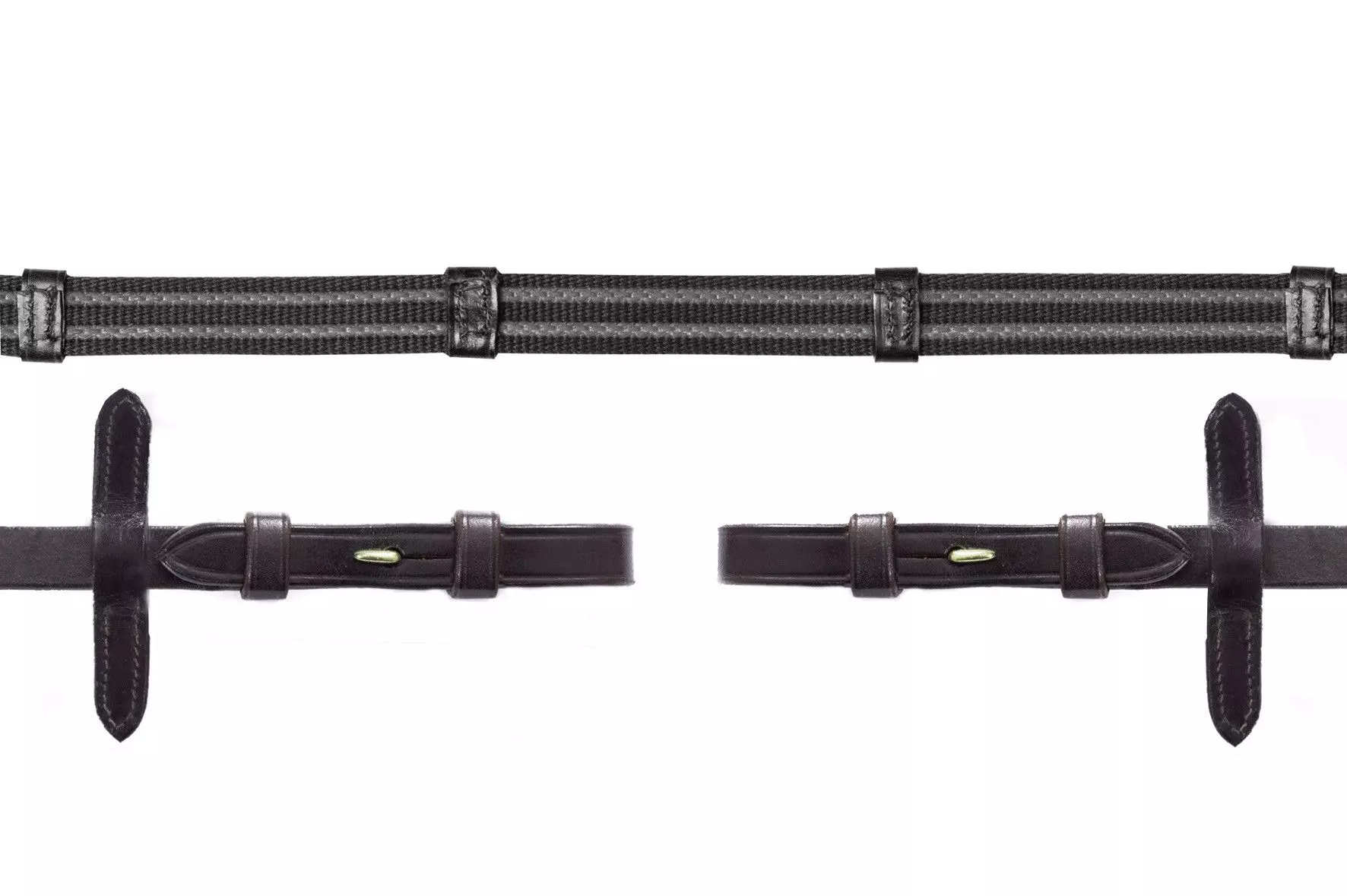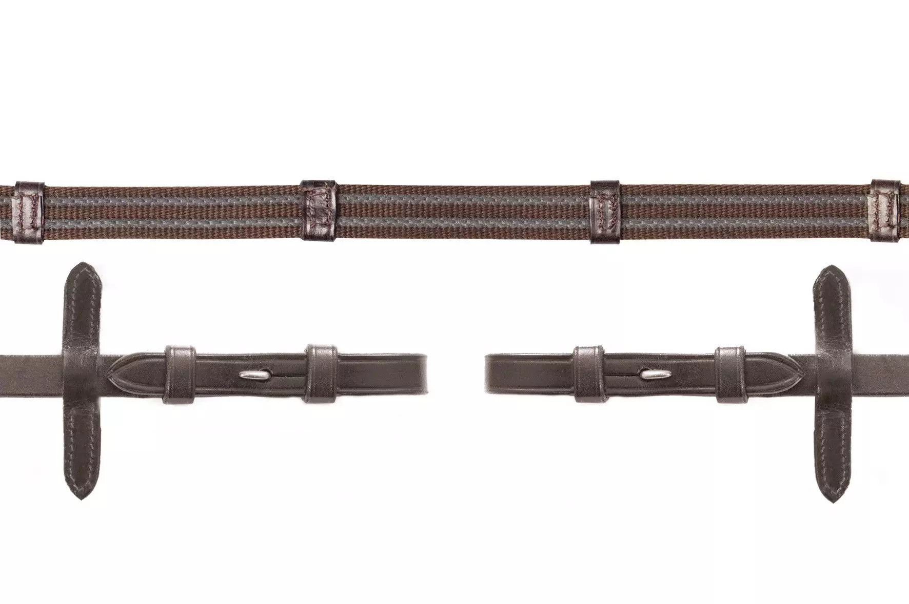 With these special reins, the classic wide strap material is criss-crossed with grip rubber. As a result, the Schockemohle RUBBER TIED GRIP REIN with the bridle hook is soft and still has a good grip in the rider’s hand. This is further improved by leather bars. The strap material used is 20 mm wide and the leather ends have martingale stoppers.