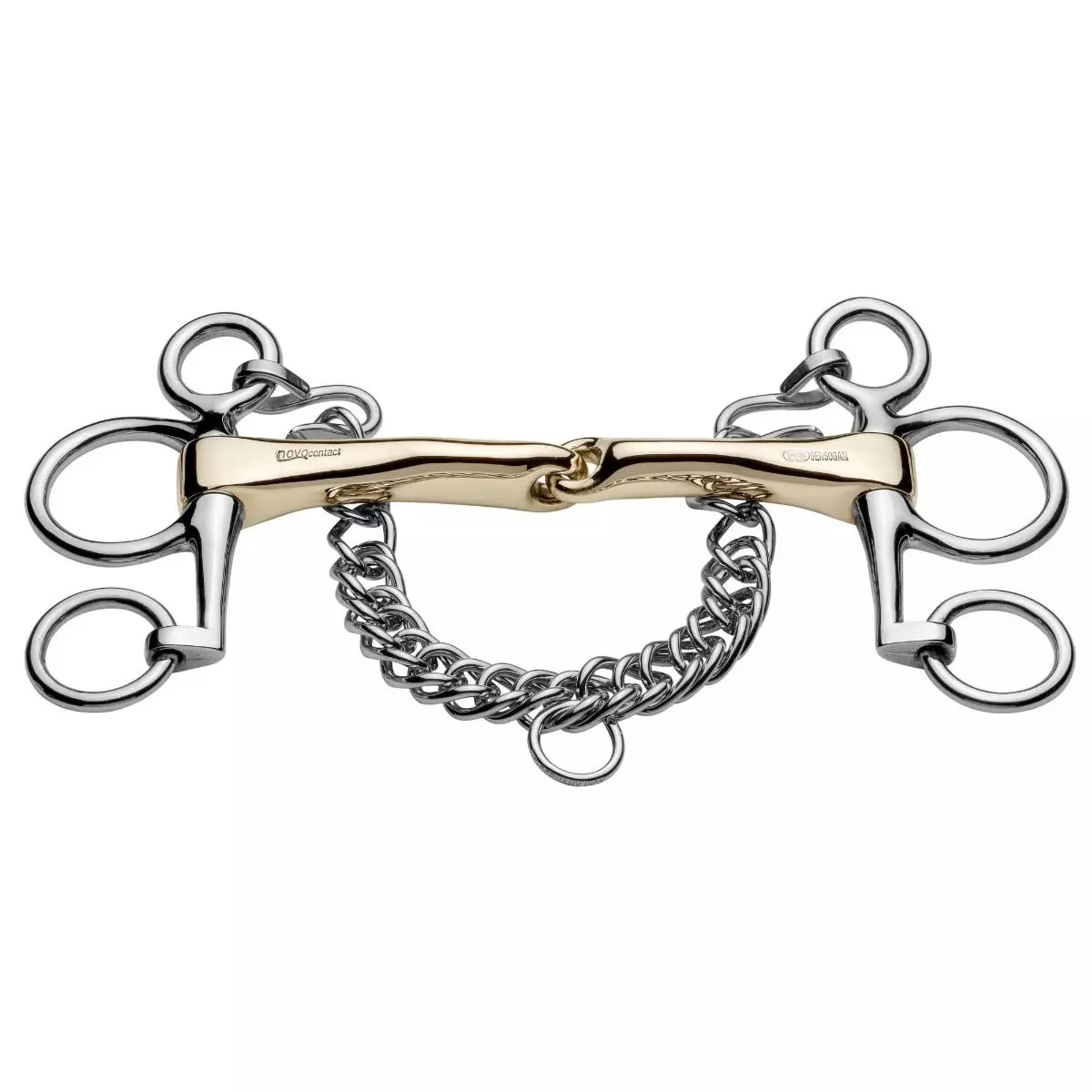 If horses tend to toss the head it makes sense to attach a second rein to the lower cheek piece ring to apply pressure on the horse’s poll. The horse will try to dodge this pressure by lowering the head. The curb chain should come into play at maximum angle of 45° (lower cheek to horse’s mouth) to avoid the horse lowering its head too much.