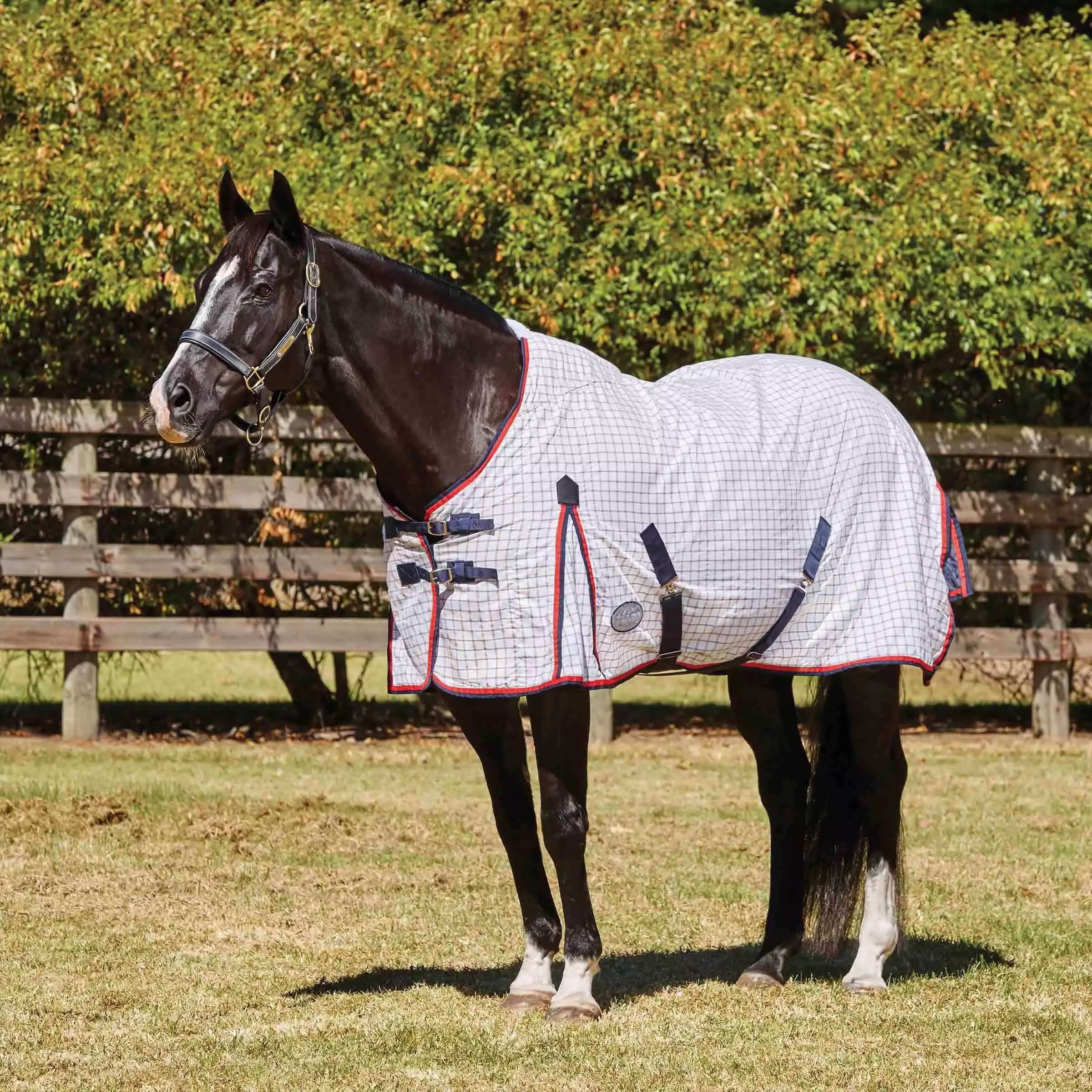 The is a breathable and cool 190g polycotton summer sheet in a standard neck style offering premium protection for the warmer months. Featuring wither relief pad for additional comfort and lined shoulders, mane and tail flap to prevent rubbing. Traditional side gusset for natural movement full wrap tail flap, twin buckle chest strap, twin low cross surcingles and adjustable removable leg straps. UV Block 95%+